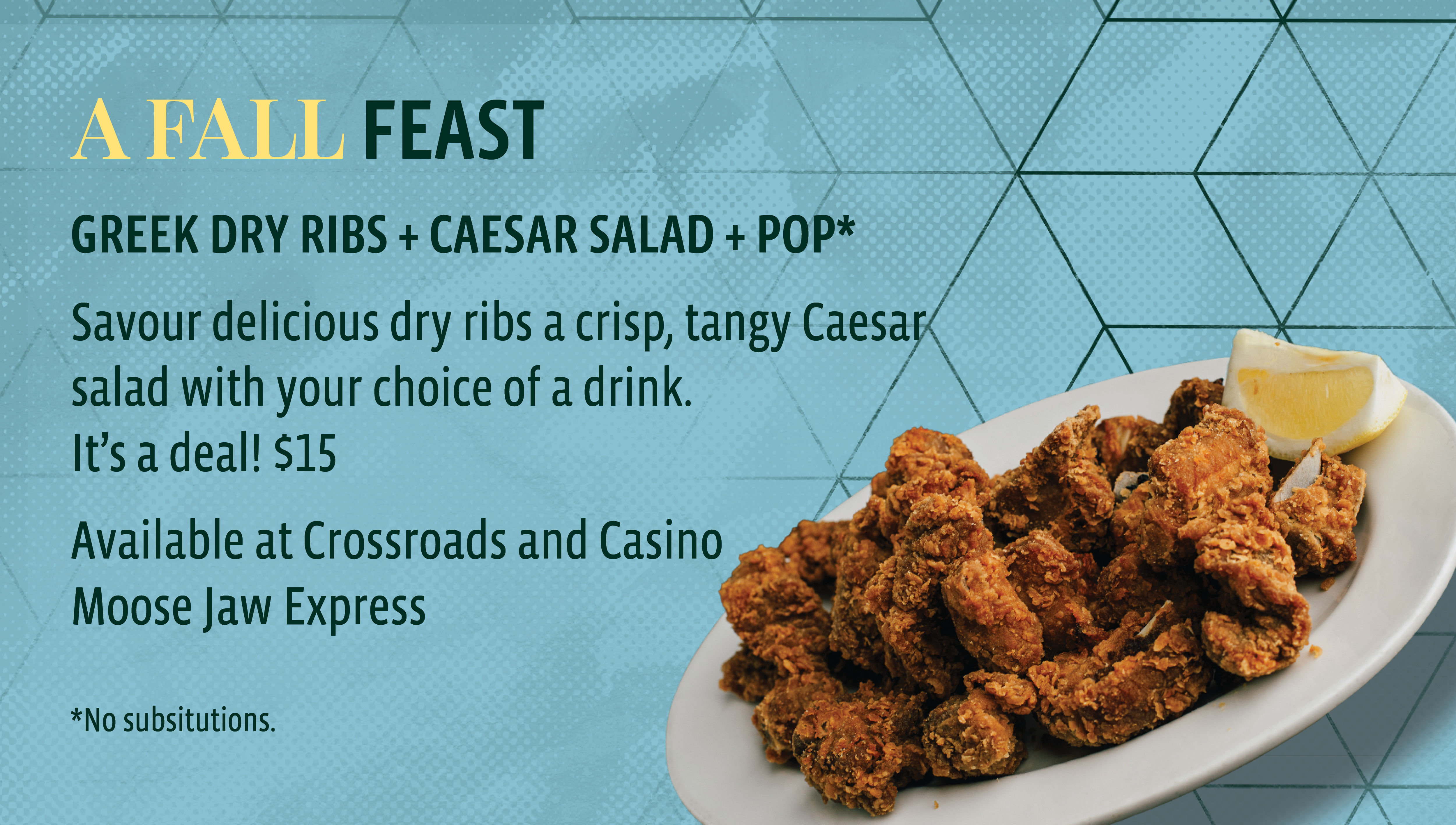 Savour delicious dry ribs a crisp, tangy Caesar salad with your choice of a drink. Available at Crossroads and Casino Moose Jaw Express.