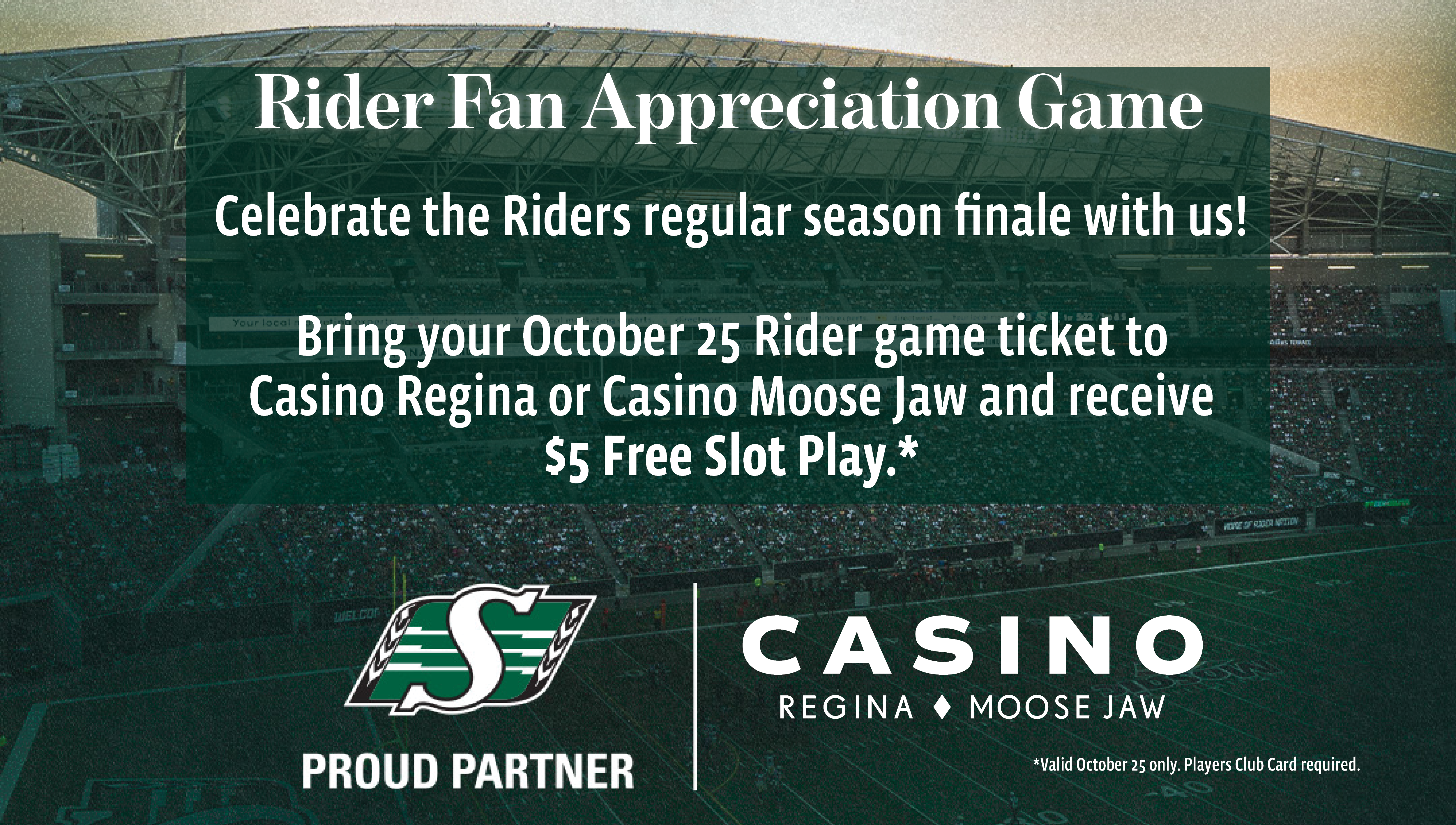 Bring your October 25 Rider game ticket to Casino Regina or Casino Moose Jaw and receive $5 Free Slot Play!*