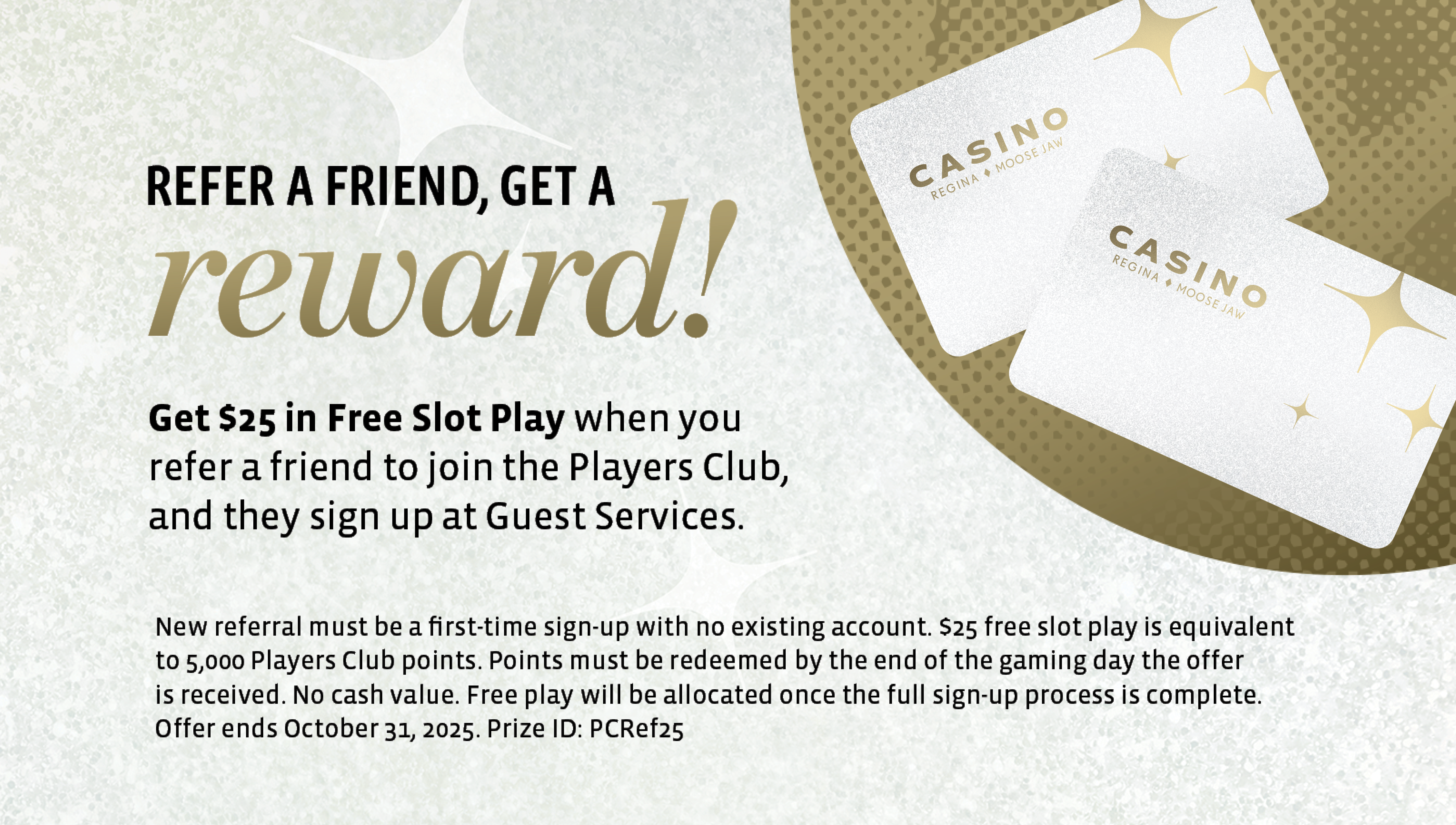 New referral must be a first-time sign-up with no existing account. $25 free slot play equivalent to 5,000 Players Club points. Points must be redeemed by the end of the gaming day the offer is received. No cash value. Free play will be allocated once the full sign-up process is complete. Offer ends October 31, 2025.